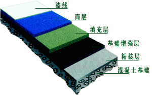塑材軟墊及丙烯酸涂面系統,其厚度約為3-4mm。內含百分百無機性纖維顏料,鋪設在已沖洗干凈值良好及排水斜度(1:100至1:150之內)的水泥或瀝青地面基礎上。